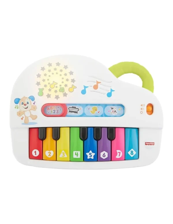 Pianoforte giocattolo portatile con 4 modalità di gioco per neonati e bambini piccoli da 6 a 36 mesi. Premi gli 8 tasti numerati per attivare luci, suoni e canzoni educative. Fai scorrere la levetta per alternare le diverse modalità di gioco: note di pianoforte vere, versi dell’anatra o della mucca oppure contenuti d’apprendimento. Premi il pulsante a forma di globo per selezionare la lingua: italiano, spagnolo castigliano, portoghese o inglese. Fornito di pratica maniglia per il trasporto.