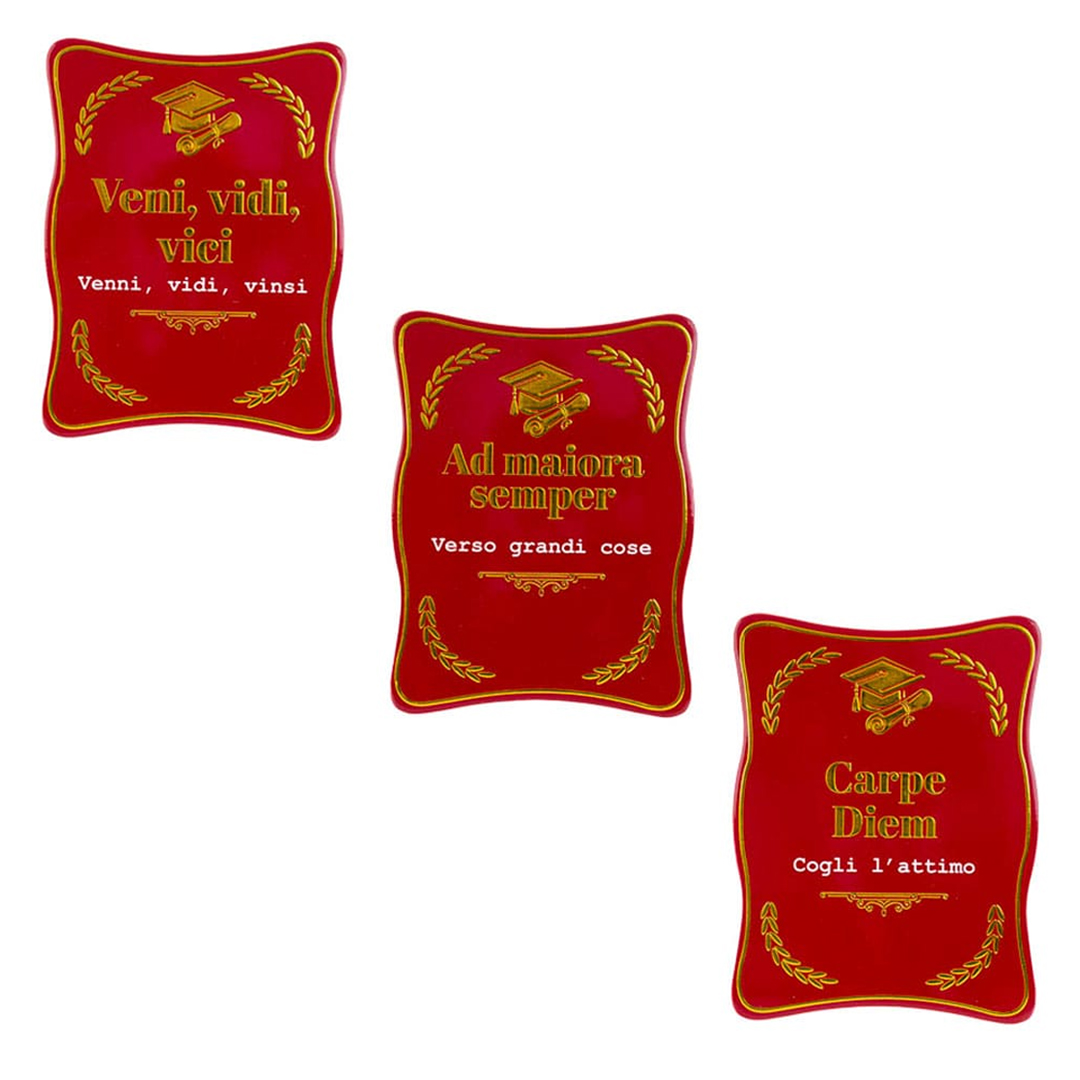 Celebra il traguardo della Laurea con un tocco di ispirazione! Le nostre calamite a forma di pergamena, della linea “Le Stelle”, sono il ricordo perfetto. Disponibili con tre celebri frasi latine: “Veni, vidi, vici”, “Ad maiora semper” e “Carpe Diem”, ognuna con la sua traduzione. Un piccolo simbolo magnetico, grande nel significato.